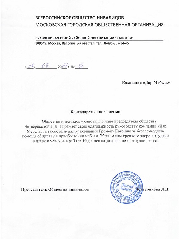 Общество инвалидов "Капотня" в лице председателя общества Четвериковой Л.Д. выражает свою благодарность руководству компаний "ДАР МЕБЕЛЬ", а так же менеджеру компании Громову Евгению за безвозмездную помощь обществу в приобретении мебели. Желаем Вам крепкого здоровья,удачи в делах и успехов на работе. Надеемся на дальнейшее сотрудничество.