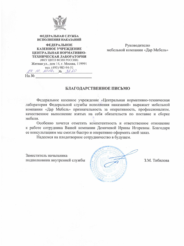 Федеральное казенное учреждение "Центральная нормативно-техническая лаборатория Федеральной службы исполнения наказаний" выражает мебельной компании "Дар Мебель"признательность за оперативность, профессионализм, качественное выполнение взятых на себя обязательств по поставке и сборке мебели. Особенно хочется отметить компетентность и ответственное отношение к работе сотрудника Вашей компании Демичевой Ирины Игоревны. Благодаря ее консультациям мы смогли быстро и оперативно оформить свой заказ. Надеемся на плодотворное сотрудничество в будущем.