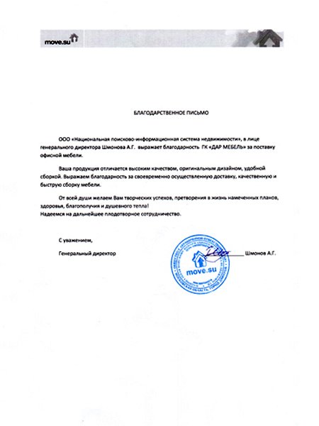 OOO "Национальная поисково-информационная система недвижимости, в дице генерального директора Шмонова А.Г. ГК "ДАР МЕБЕЛЬ" за поставку офисной мебели. Ваша продукция отличается высоким качеством, оригинальным дизайном, удобной сборкой. Выражаем благодарность за своевременно осуществленную доставку, качественну и быструю сборку мебели. Надеемся на дальнейшее плодотворное сотрудничество.