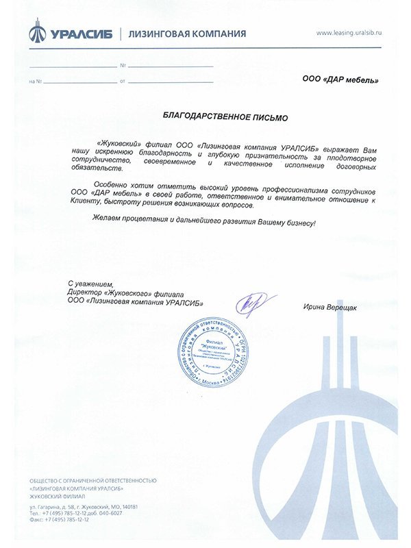 "Жуковский филиал ООО "Лизинговая компания УРАЛСИБ" выражает Вам нашу искреннюю благодарность и глубокую признательность за плодотворных обязательств. Особенно хотим отметить высокий уровень профессионализма сотрудников ООО "ДАР МЕБЕЛЬ" в своей работе, ответственное и внимательное отношение к Клиенту, быстроту решения возникающих вопросов. Желаем процветания и дальнейшего развития Вашему бизнесу!