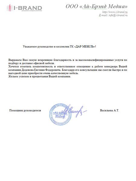 Уважаемое руководство и коллектив ООО "ДАР МЕБЕЛЬ" Выражаем Вам самую искреннюю благодарность и за высококвалифицированные услуги по подбору и доставке офисной мебели. Хочется отметить компетентность и ответственное отношение к работе сотрудников Вашей компании. Благодаря их консультациям мы смогли быстро и по годной цене приобрести очень качественную мебель. Желаем успехов и процветания Вашей компании.