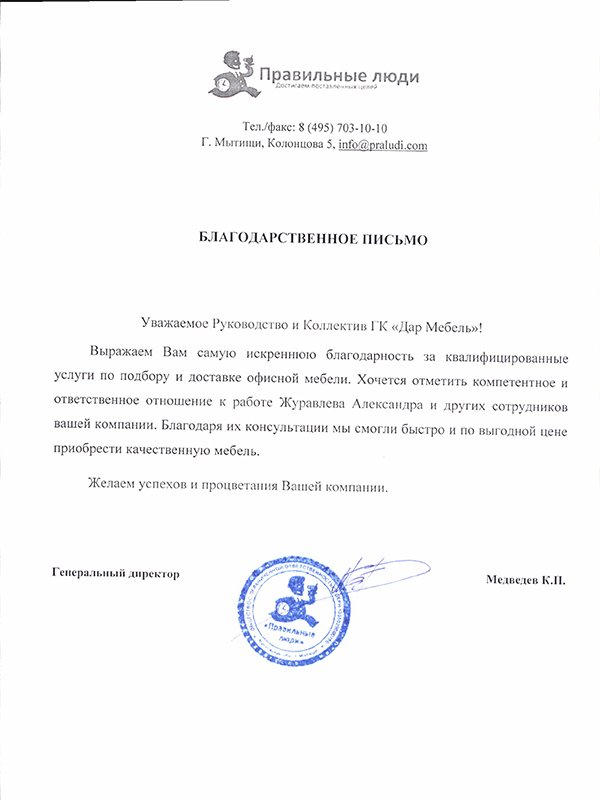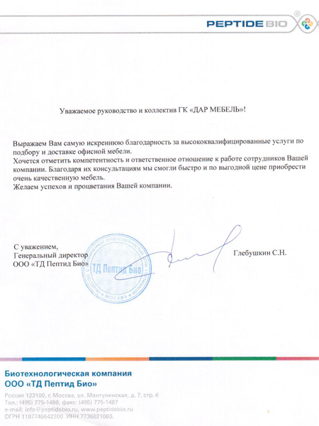 Уважаемое руководство и коллектив ГК "ДАР МЕБЕЛЬ" Выражаем Вам саму искреннюю благодарность и за высококвалифицированные услуги по подбору и доставке офисной мебели. Хочется отметить компетентность и ответственное отношение к работе сотрудников Вашей компании. Благодаря их консультациям мы смогли быстро и по выгодной цене приобрести очень качественную мебель. Желаем успехов и процветания Вашей компании.