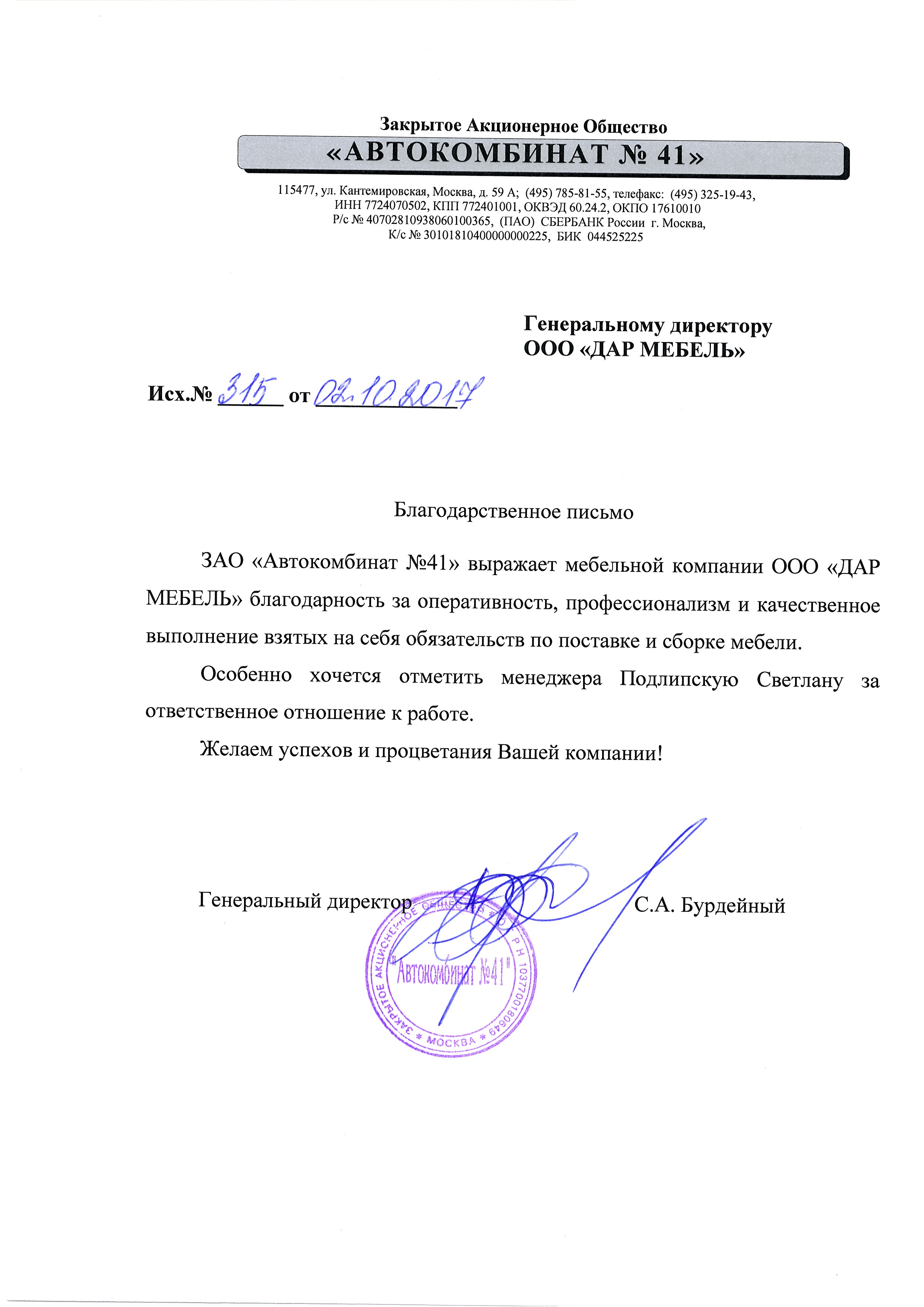 Благодарственное письмо ЗАО «Автокомбинат №41» выражает мебельной компании ООО «ДАР МЕБЕЛЬ» благодарность за оперативность, профессионализм и качественное выполнение взятых на себя обязательств по поставке и сборке мебели. Особенно хочется отметить менеджера Подлипскую Светлану за ответственное отношение к работе. Желаем успехов и процветания Вашей компании!