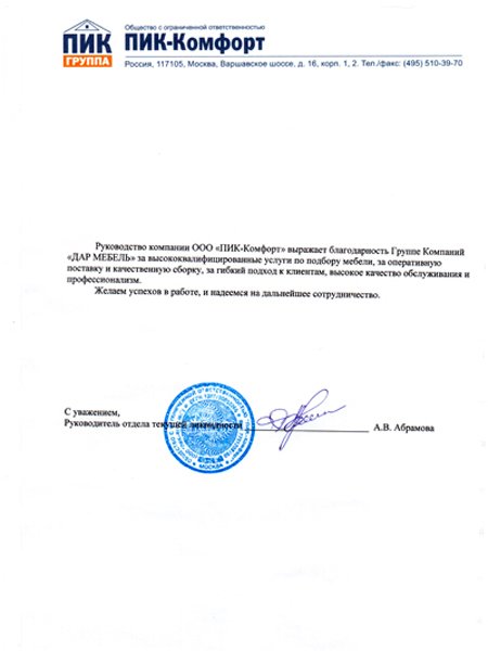Руководство компании ООО "ПИК-Комфорт" выражает благодарность Группе Компаний "ДАР МЕБЕЛЬ" за высококвалифицированные услуги по подбору мебели за оперативную поставку и качественную сборку, за гибкий подход к клиентам, высокое качество обслуживания и профессионализм. Желаем успехов в работе, и надеемся на дальнейшее сотрудничество. www.pik-comfort.ru