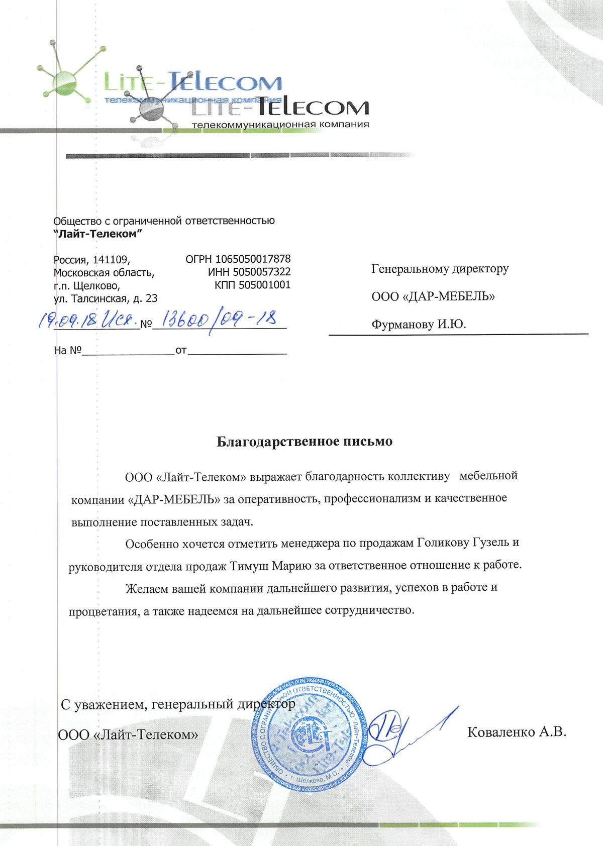 ООО «Лайт-Телеком» выражает благодарность коллективу мебельной компании «ДАР-МЕБЕЛЬ», за оперативность, профессионализм и качественное выполнение поставленных задач. Особенно хочется отметить менеджера по продажам Голикову Гузель и руководителя отдела продаж Тимуш Марию за ответственное отношение к работе. Желаем вашей компании дальнейшего развития, успехов в работе и процветания, а так же надеемся на дальнейшее сотрудничество. Генеральный директор ООО «Лайт-Телеком» Коваленко А.В.