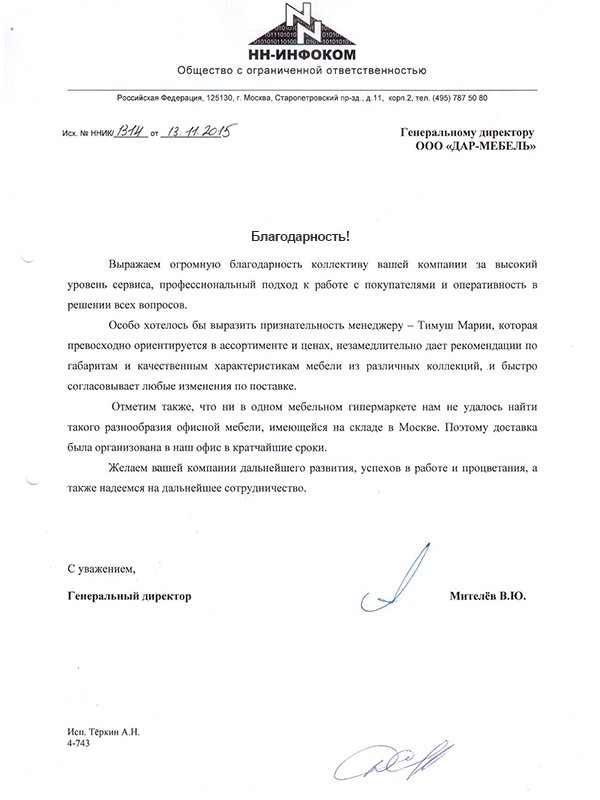 Выражаем огромную благодарность коллективу вашей компании за высокий уровень сервиса, профессиональный подход к работе с покупателями и оперативность в решении всех вопросов. Особо хотелось бы выразить признательность менеджеру – Тимуш Марии, которая превосходно ориентируется в ассортименте и ценах, незамедлительно дает рекомендации по габаритам и качественным характеристикам мебели из различных коллекций, и быстро согласовывает любые изменения по поставке. Отметим также, что ни в одном мебельном гипермаркете нам не удалось найти такого разнообразия офисной мебели, имеющейся на складе в Москве. Поэтому доставка была организована в наш офис в кратчайшие сроки. Желаем вашей компании дальнейшего развития, успехов в работе и процветания, а также надеемся на дальнейшее сотрудничество.