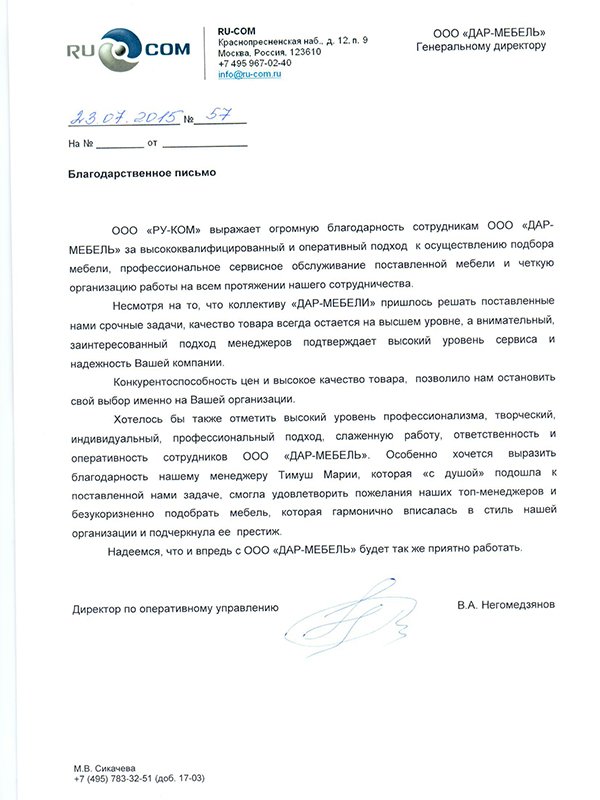 ООО "РУ-КОМ" выражает огромную благодарность сотрудникам ООО "ДАР МЕБЕЛЬ" за высококвалифицированный и оперативный подход к осуществлению подбора мебели, профессиональное сервисное обслуживание поставленной мебели и четкую организацию работы на всем протяжении нашего сотрудничества. Несмотря на то, что коллективу "ДАР МЕБЕЛЬ" пришлось решать поставленные нами срочные задачи, качество товара всегда остается на высшем уровне, а внимательный заинтересованный подход менеджеров подтверждает высокий уровень сервиса и надежность Вашей компании. Конкурентоспособность цен и высокое качество товара, позволило нам остановить свой выбор именно на Вашей организации. Хотелось бы так же отметить высокий уровень профессионализма, творческий, индивидуальный профессиональный подход, сложную работу, ответственность и оперативность сотрудников ООО "ДАР МЕБЕЛЬ". Особенно хочется выразить благодарность нашему менеджеру Тимуш Марии, которая " с душой " подошла к поставленной нами задаче, смогла удовлетворить пожелания наших топ-менеджеров и безукоризненно подобрать мебель, которая гармонично вписалась в стиль нашей организации и подчеркнула ее престиж.